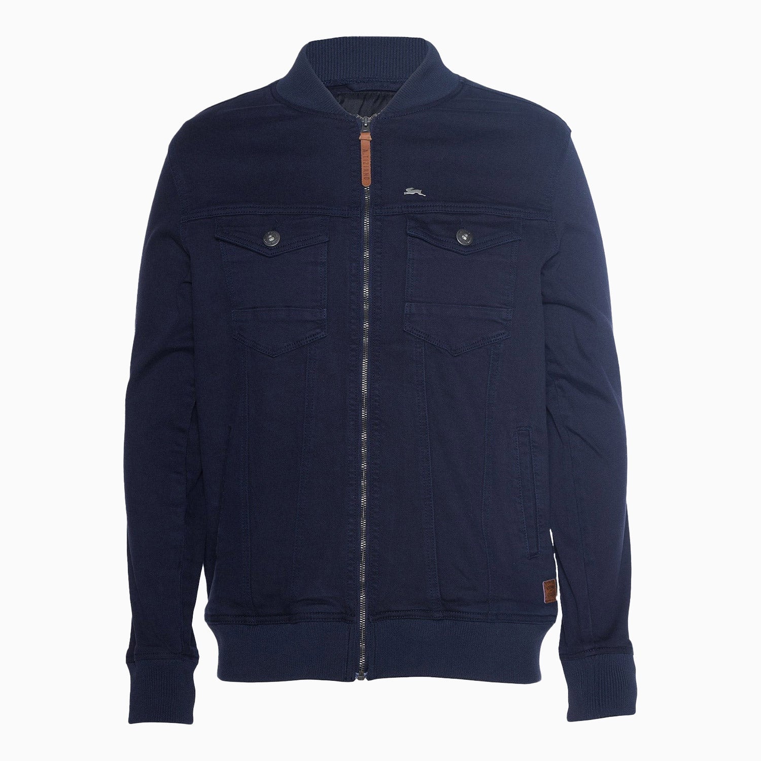 Leather patch label at the lower left corner near the hem