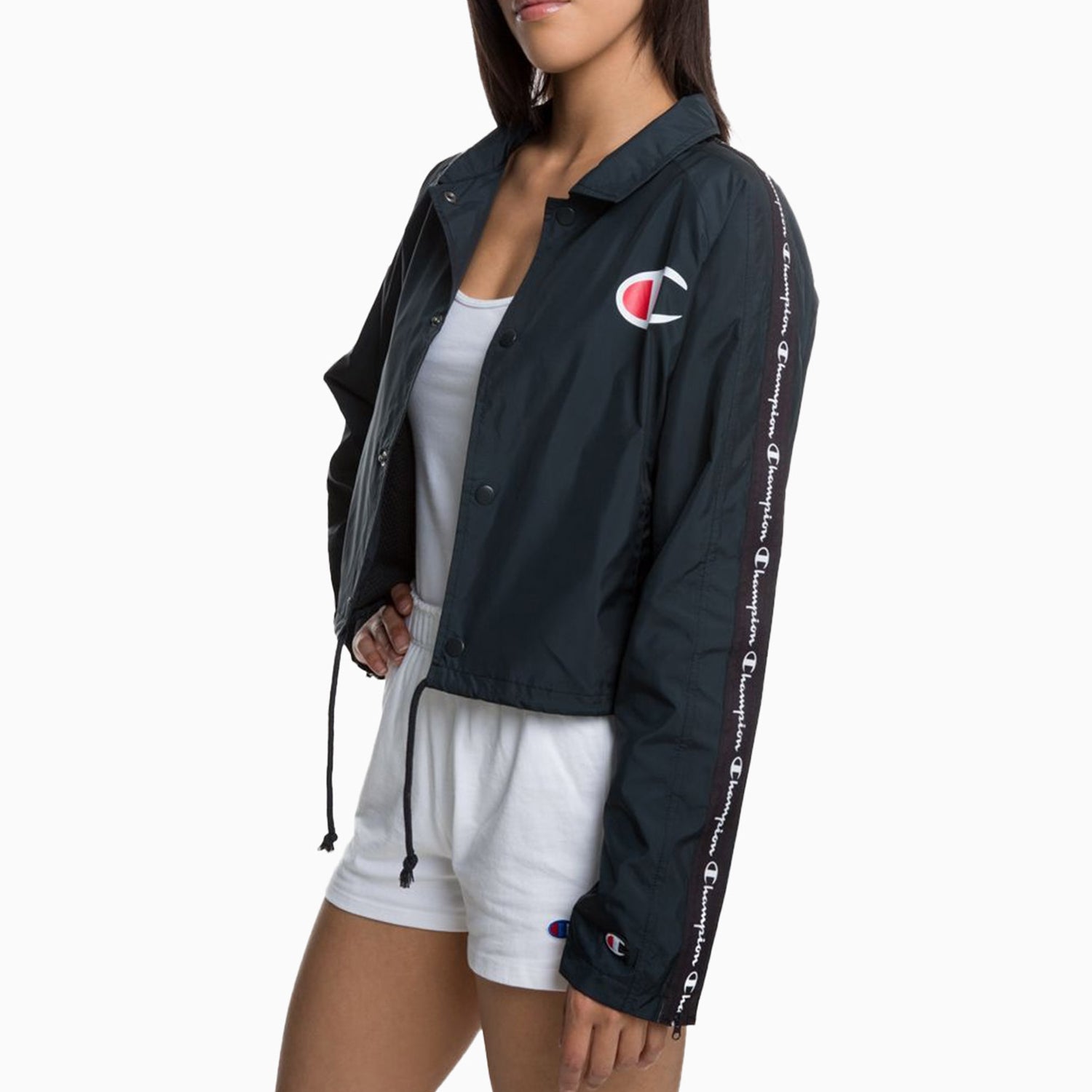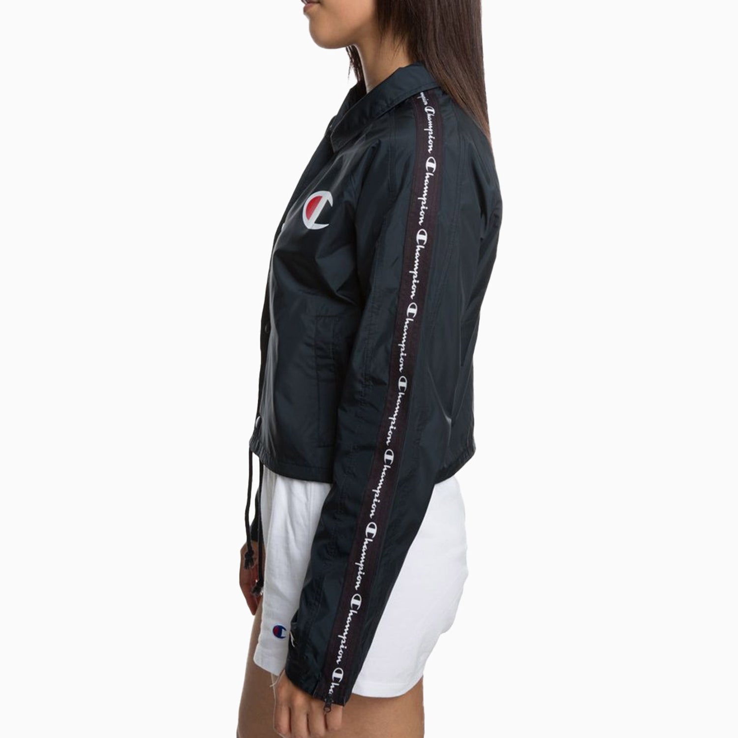 This women's coaches jacket features stylish zipper tape detailing and a cropped design. It provides optimal comfort and a modern look. Made with durable materials, it's perfect for outdoor activities or casual wear. Stay trendy and comfy with this versatile jacket.