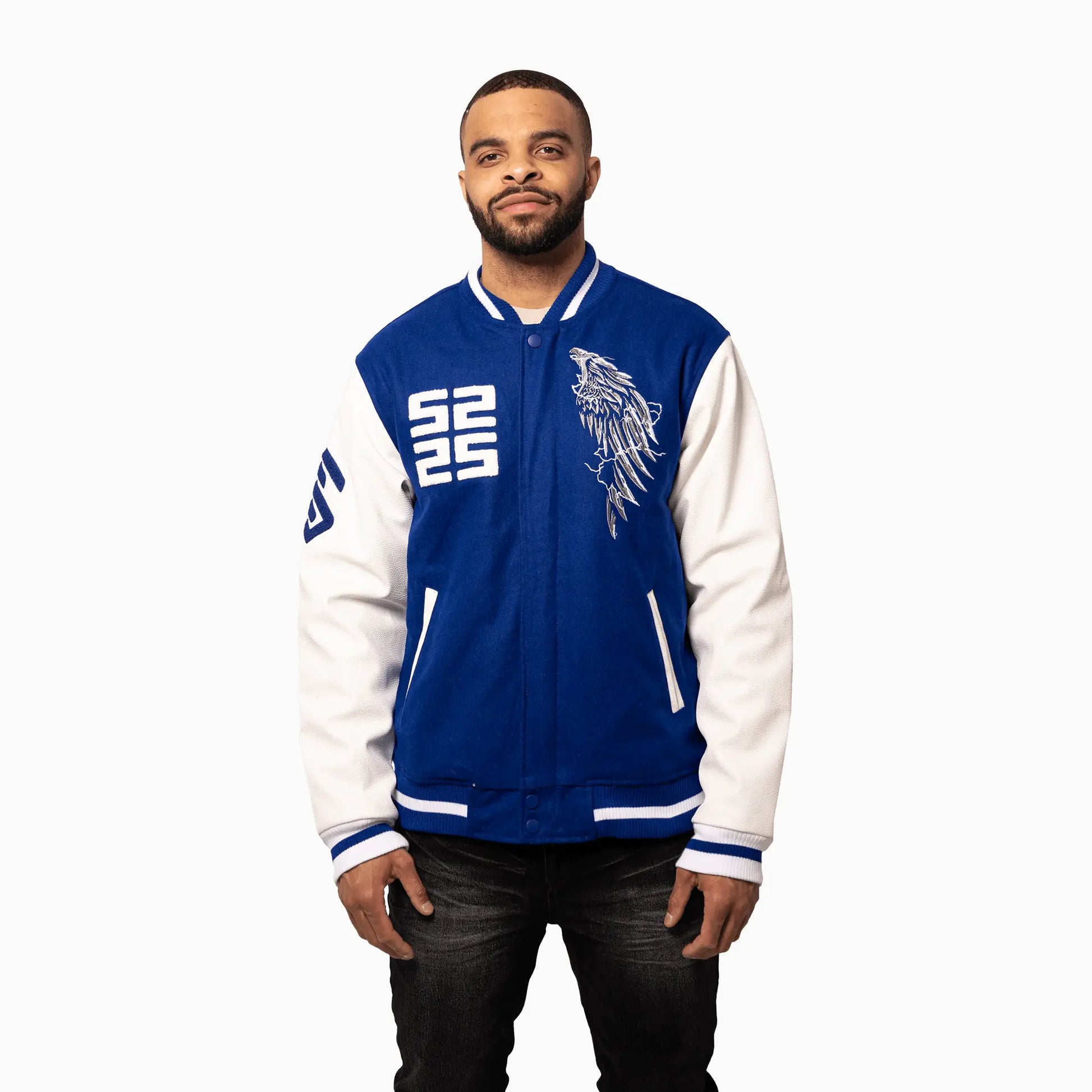 Introducing the Men's Wings Wool Varsity Jacket by Savar. Crafted with high-quality wool, this varsity jacket boasts a sleek and stylish design. Perfect for any occasion, its durable material will keep you warm and comfortable while making a statement. Make a bold fashion statement with 100% authentic materials.