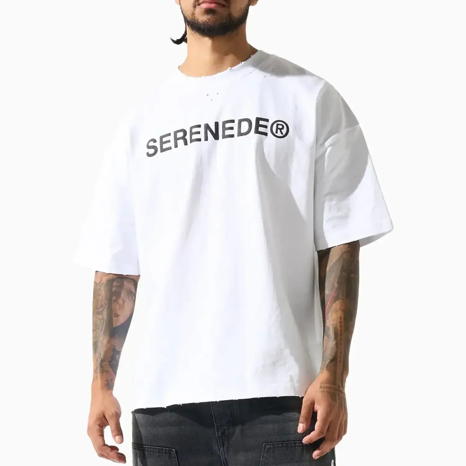 The SERENEDE® "CLASSIC" white t-shirt features the SERENEDE® logo printed in a black textured ink on the chest. Crafted for a modern, laid-back look. This men’s t-shirt features a unique distressed detailing at the neck and sleeves, giving it a rugged edge. A slightly cropped fit offers a contemporary twist. Finished with SERENEDE® branded hardware, this premium tee combines comfort and durability, making it a standout addition to any wardrobe.