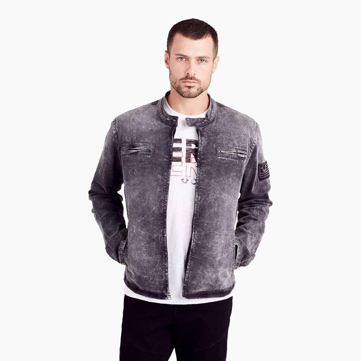 Expertly crafted for style and comfort, the Men's Moto Slim Denim Jacket by True Religion is the perfect addition to any wardrobe. Made with high-quality denim, this jacket features a slim fit and unique moto-inspired detailing for a sleek and edgy look. Upgrade your style game with this must-have piece.